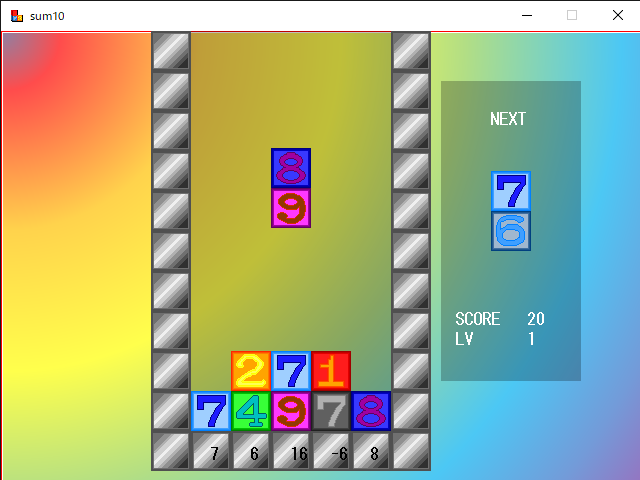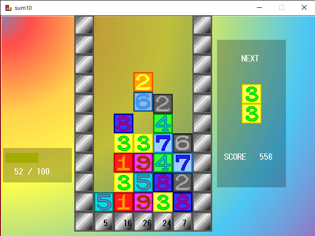 ただ、縦全体合計で10の倍数にならなくても、上から途中のブロックが10になればそれらのブロックが消えるようになります。